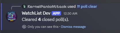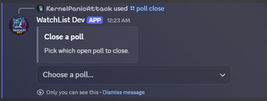 Choose the Poll you want to close. The bot will only show active polls. If there is only one poll active, the bot will auto-close the poll without the prompt