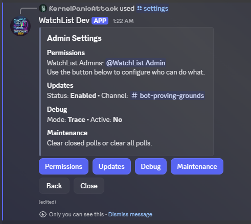 Contains settings permissions, update notifications, maintenance actions and debugging